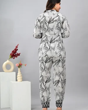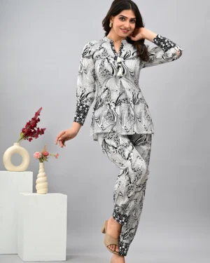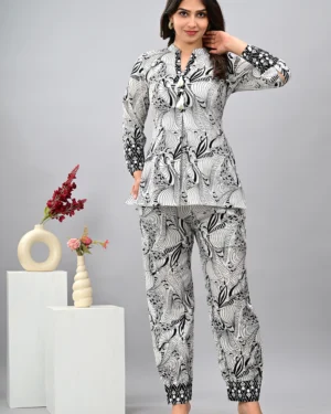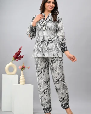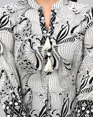 Elevate your everyday look with this Black Cotton Ikat Co-Ord Set featuring an Afghani-inspired pattern, tassel-detailed neckline, and button-accented sleeves.