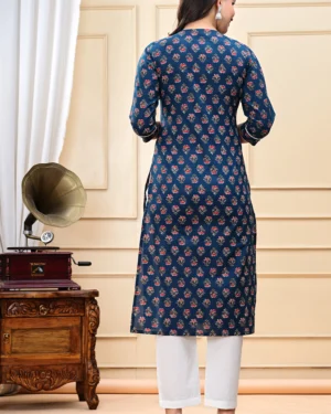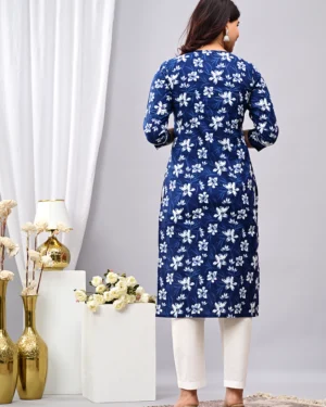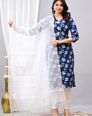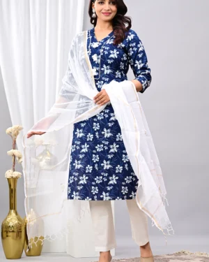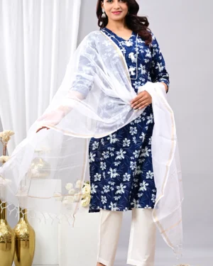 Embrace timeless elegance in this Blue Cotton Hand Block Print Kurta Set, crafted with rich indigo motifs and paired with a delicate Kota Doria dupatta for a graceful finish.
