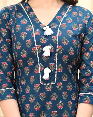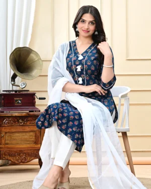 Step into timeless elegance with this Blue Cotton Ajrakh Print Kurta Set, detailed with tassels, lace accents, and paired with a sheer Kota Doria dupatta for a graceful finish.