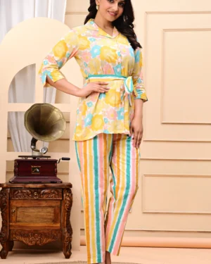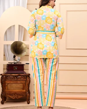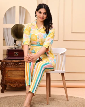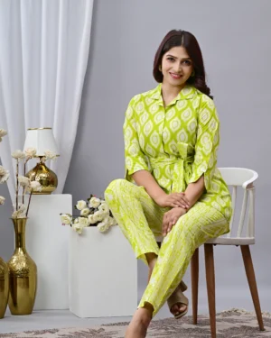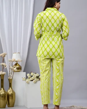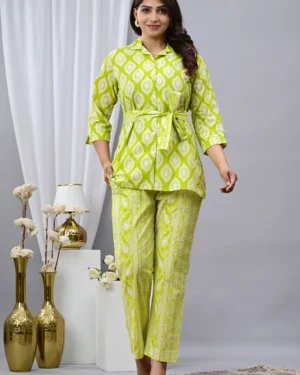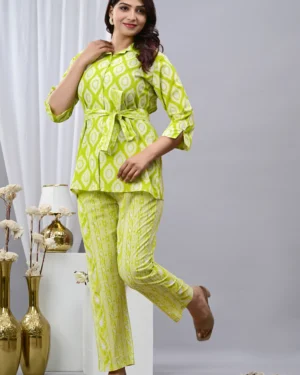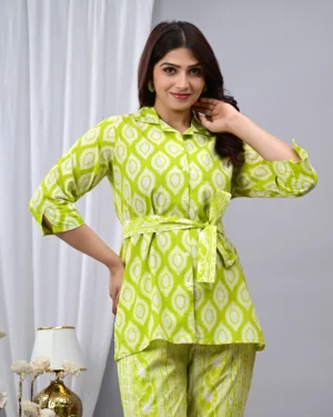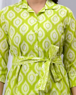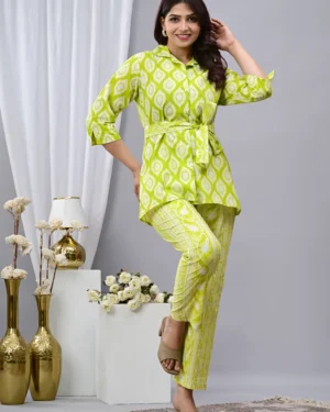 Fresh and breezy, this Green Cotton Floral Co-Ord Set features an abstract floral print, an adjustable belt, and neat button closure — an effortless statement for any day out.