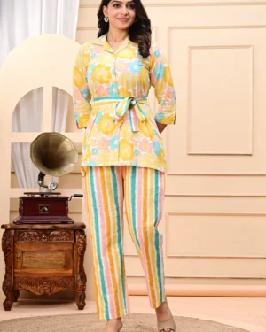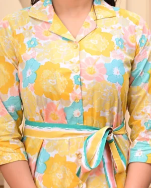 Bring effortless sunshine to your wardrobe with this breezy yellow cotton co-ord set. Featuring an abstract floral print, belt tie, and neat button closure for a flattering, easy fit.
