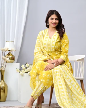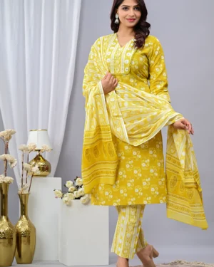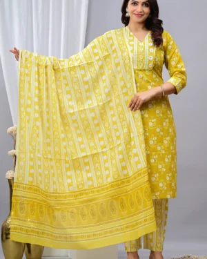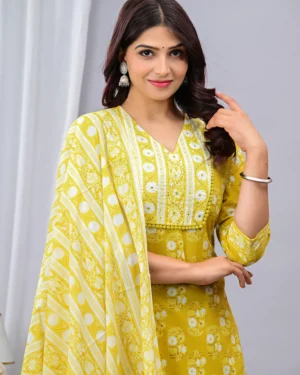 Bask in effortless charm with this Yellow Cotton Floral Kurta Set, accented with delicate hand work on the neckline and paired with a flowy printed dupatta.