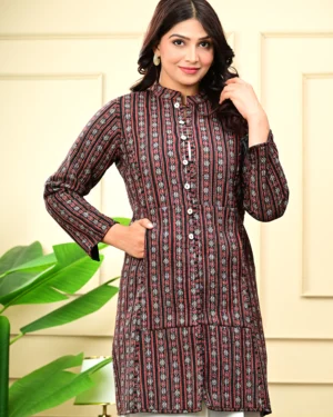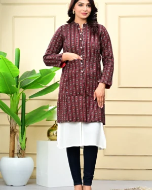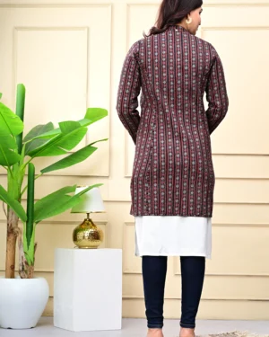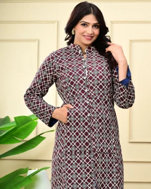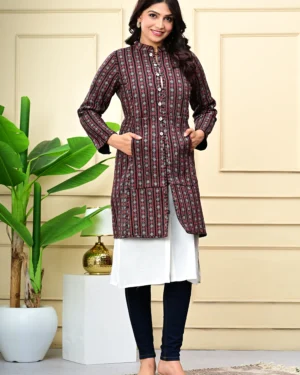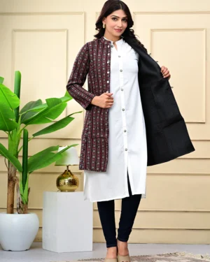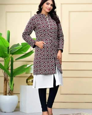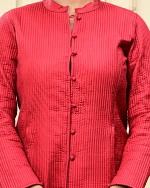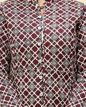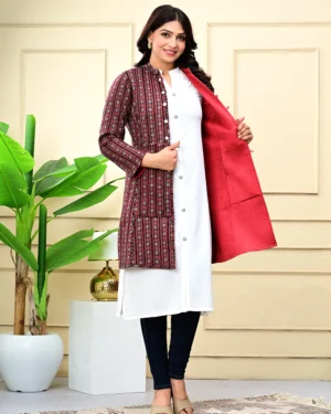 Wrap yourself in timeless warmth with our Maroon Quilted Reversible Jacket, crafted in printed cotton and rich silk for effortless elegance, inside and out.