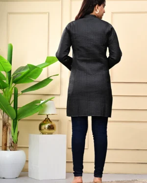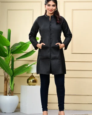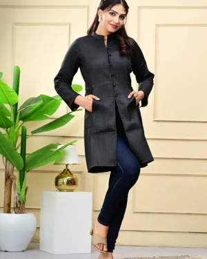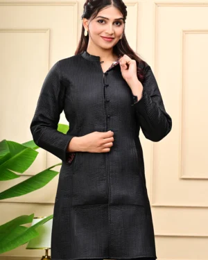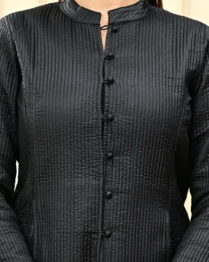 Timeless and versatile, our Black Quilted Reversible Jacket pairs artisan block-printed cotton with rich silk — two statement looks in one effortless layer.