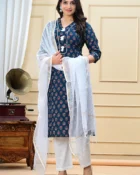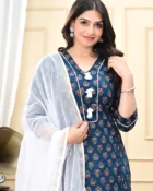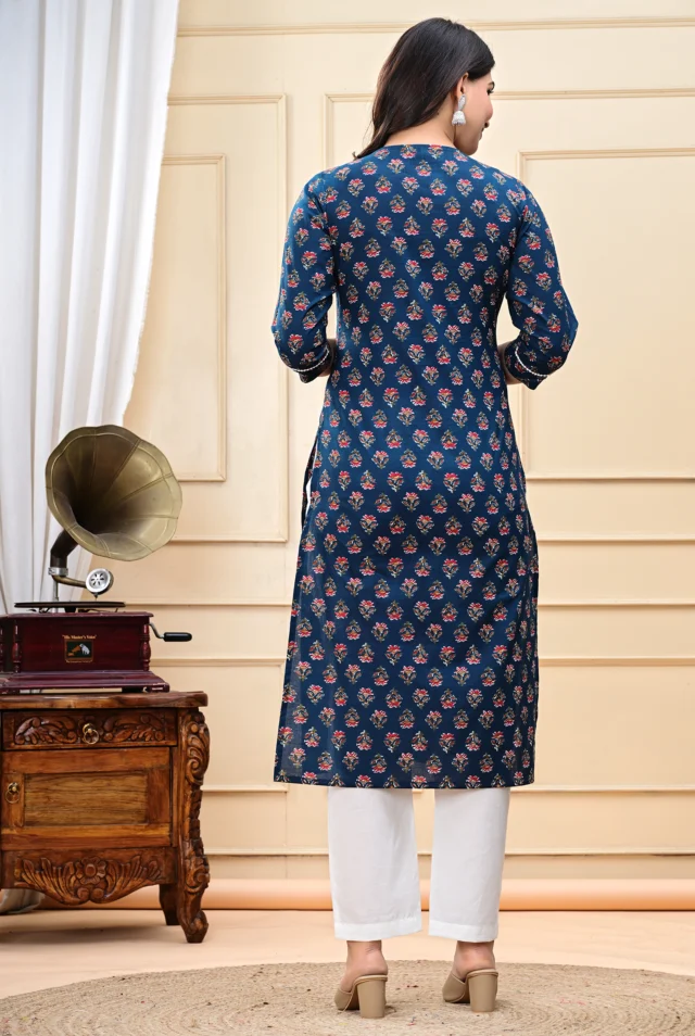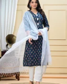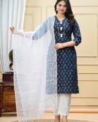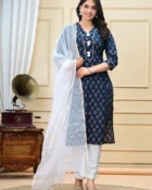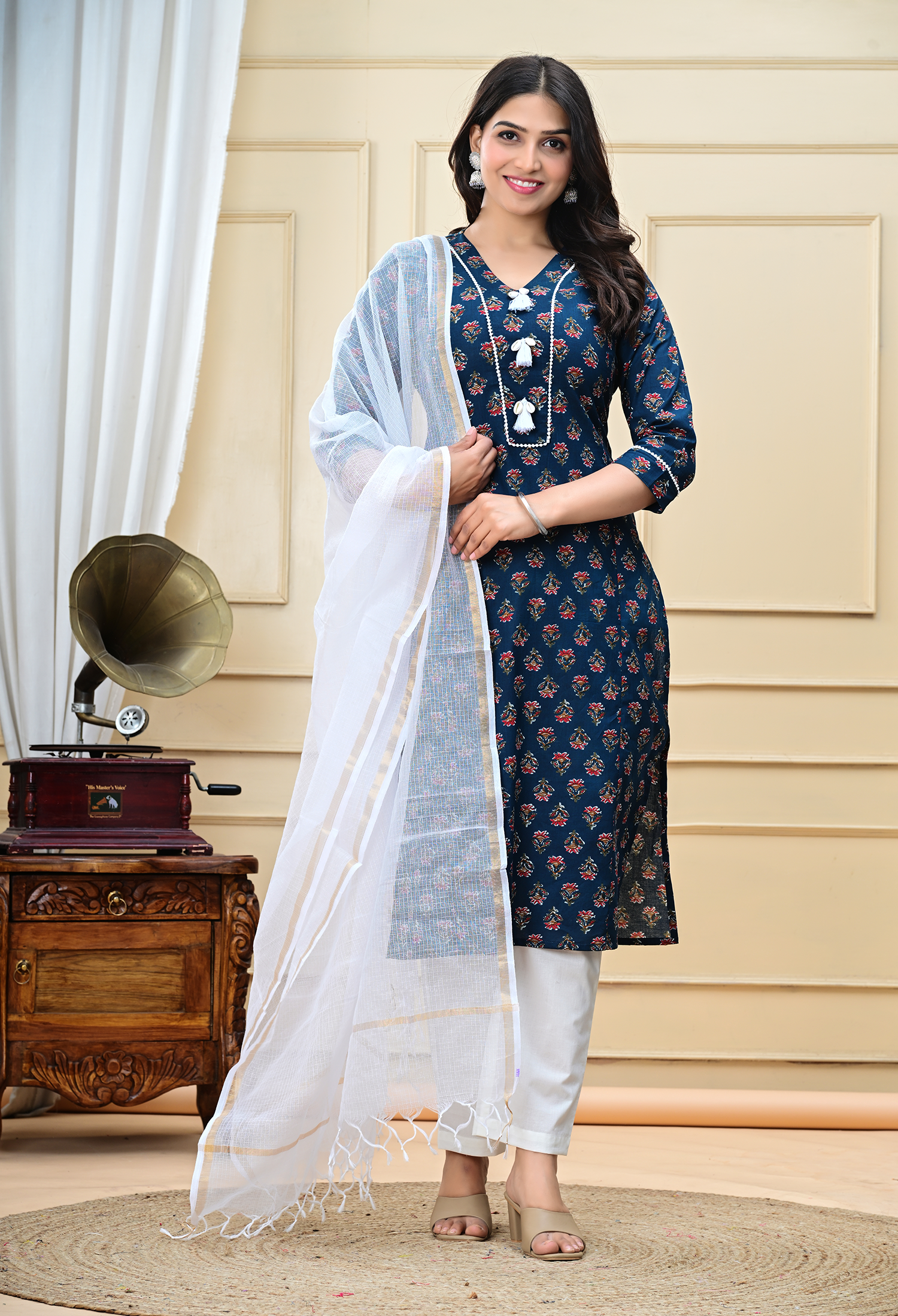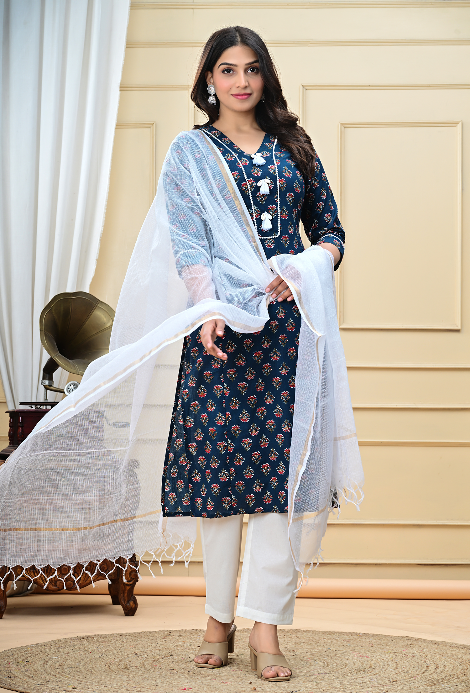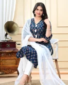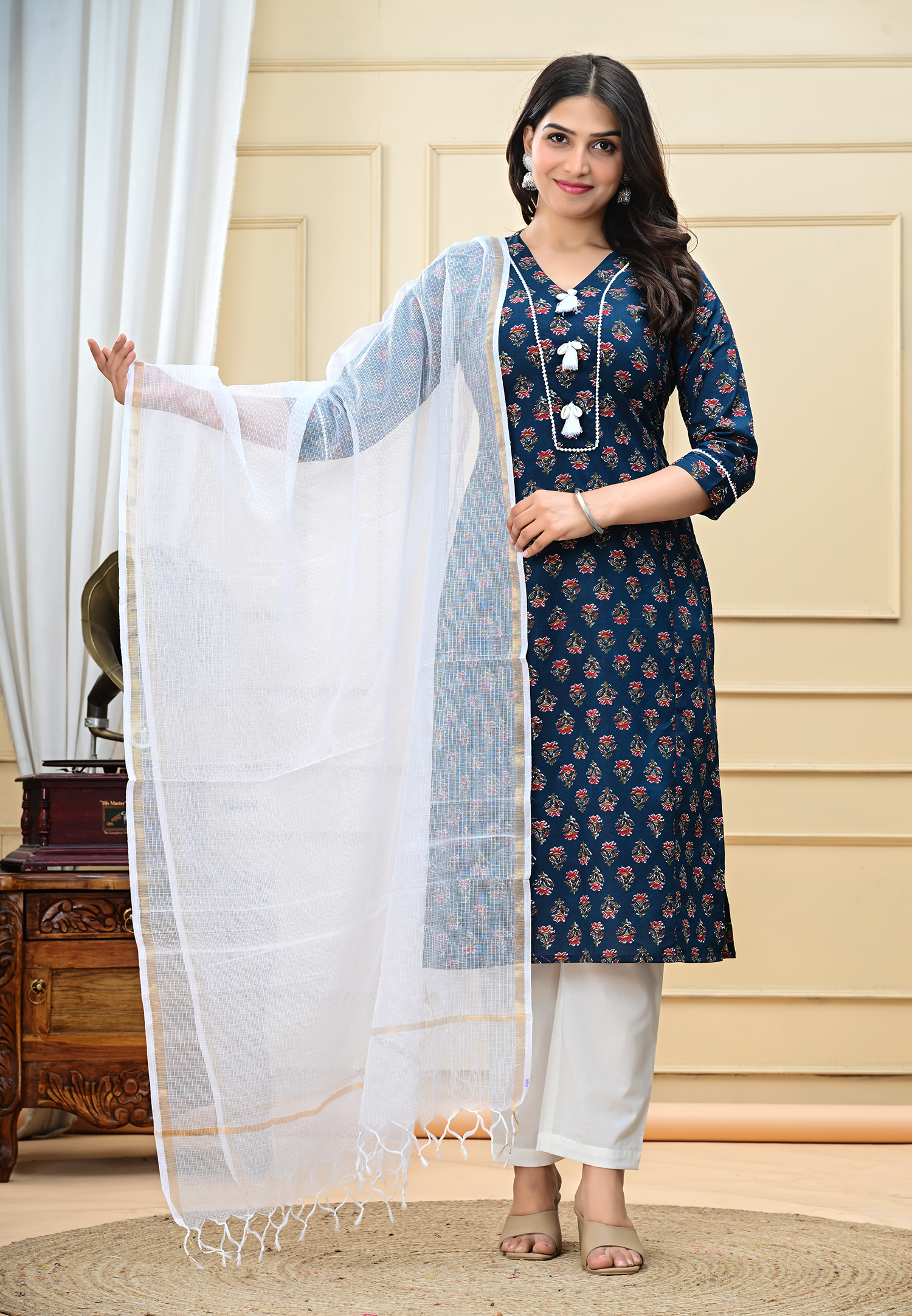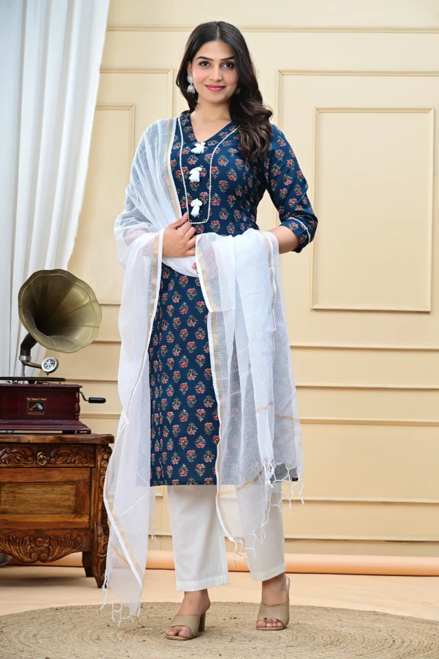 Embrace timeless elegance in this Blue Cotton Hand Block Print Kurta Set, crafted with rich indigo motifs and paired with a delicate Kota Doria dupatta for a graceful finish.