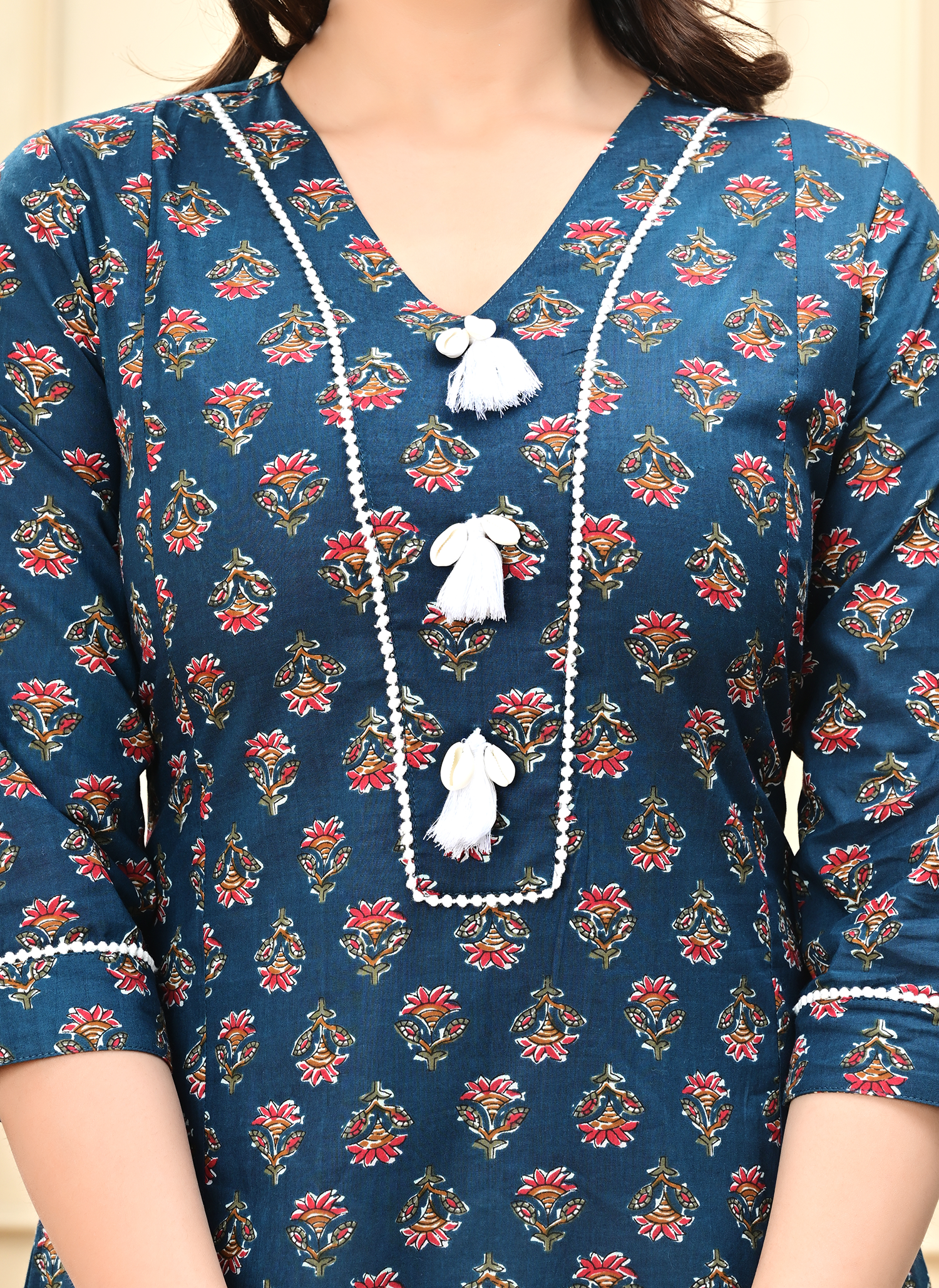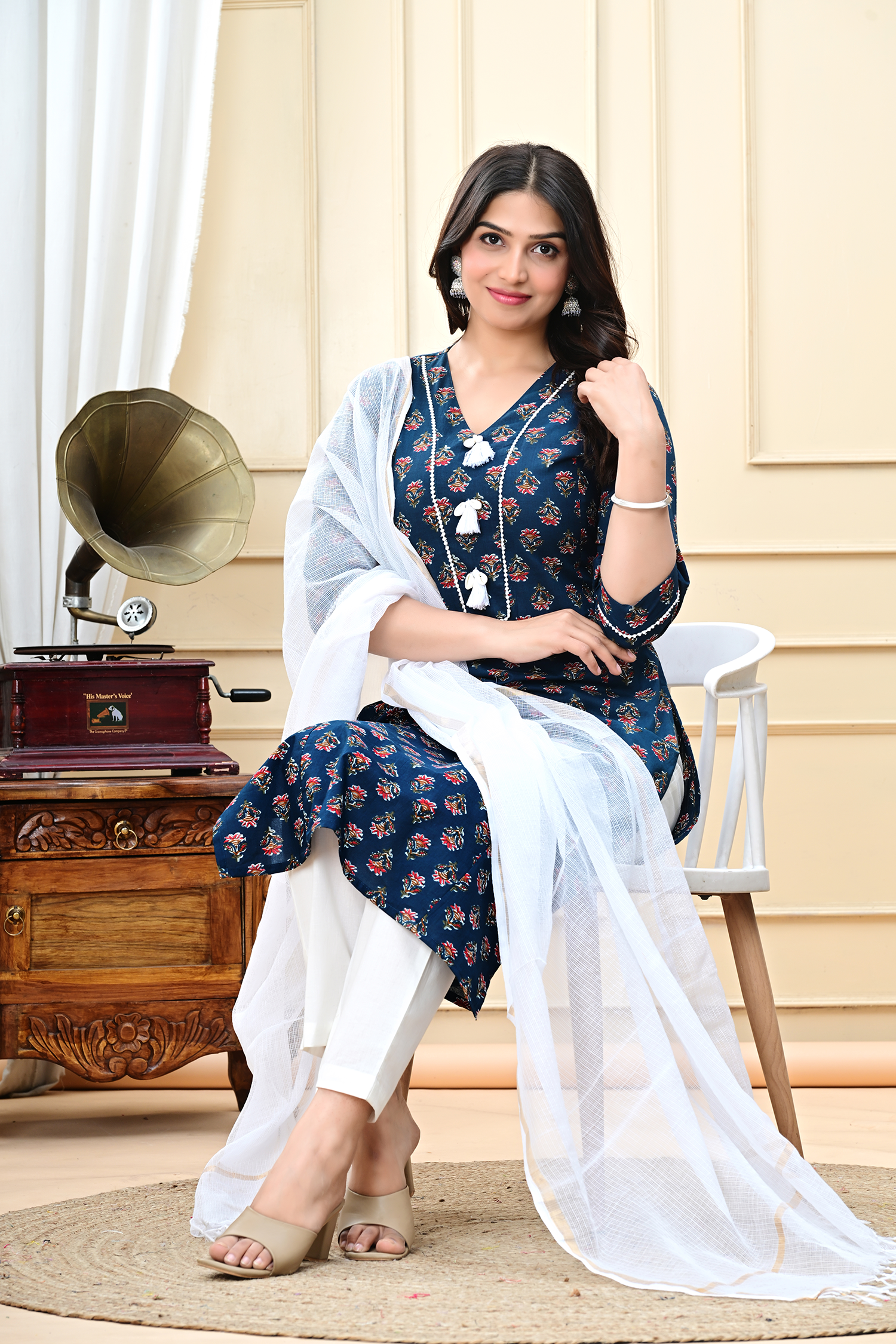 Step into timeless elegance with this Blue Cotton Ajrakh Print Kurta Set, detailed with tassels, lace accents, and paired with a sheer Kota Doria dupatta for a graceful finish.