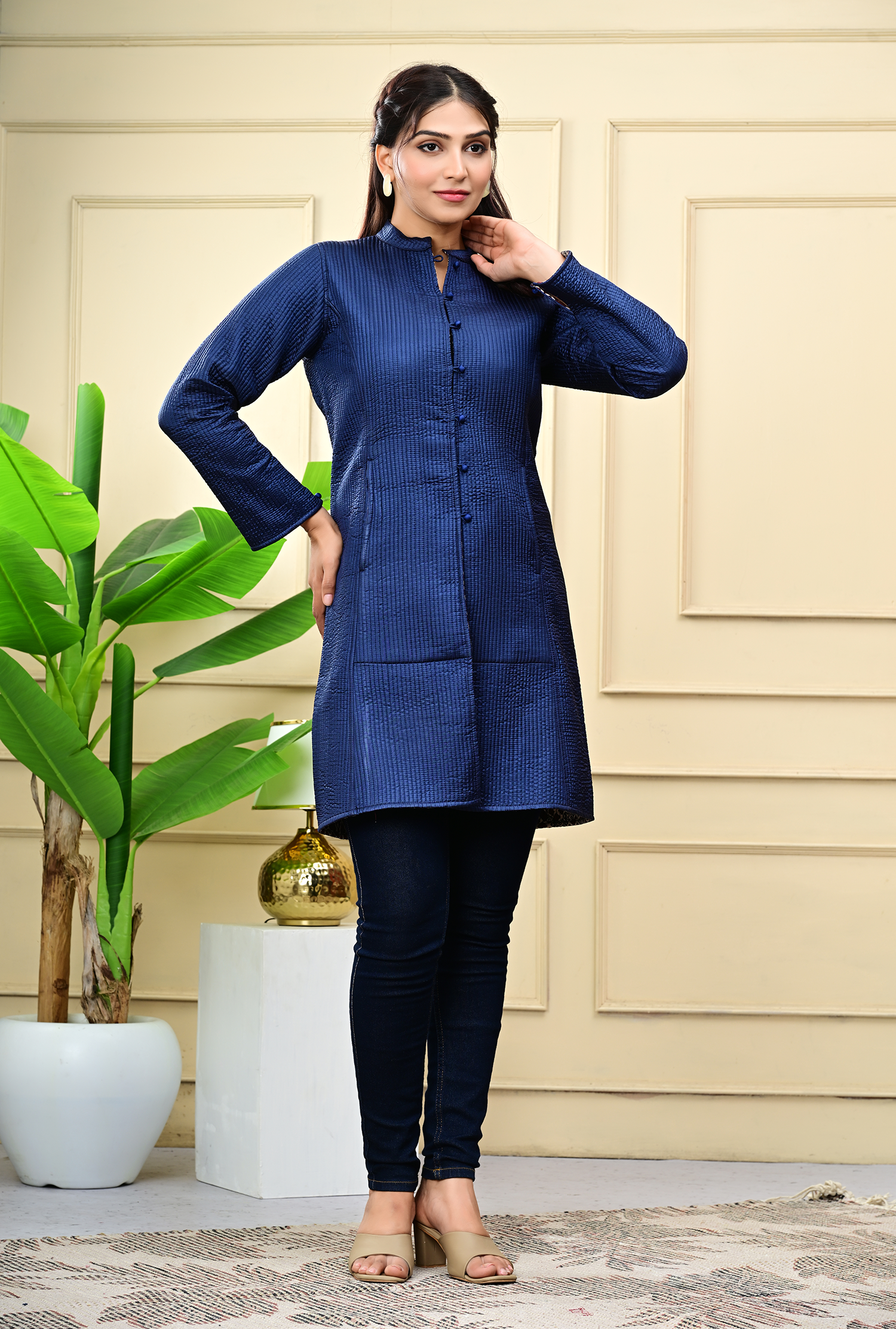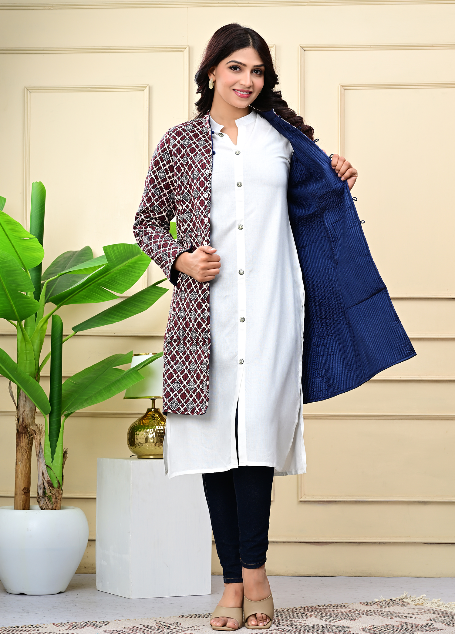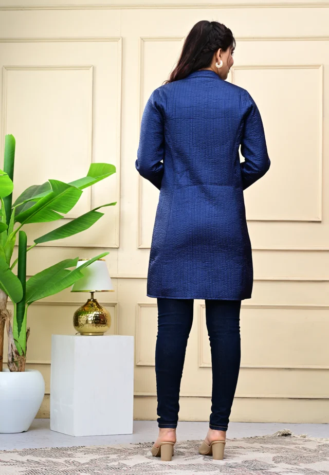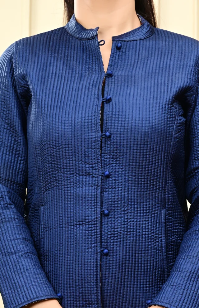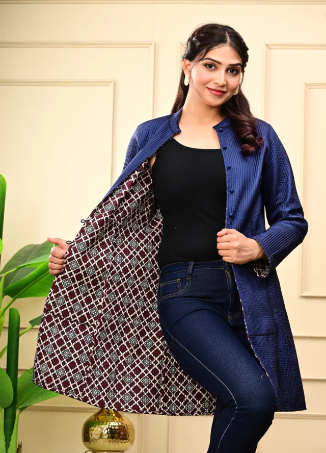 Layer up in timeless style with our Blue Quilted Reversible Jacket — handcrafted in block-printed cotton and luxurious silk for versatile, all-season elegance.