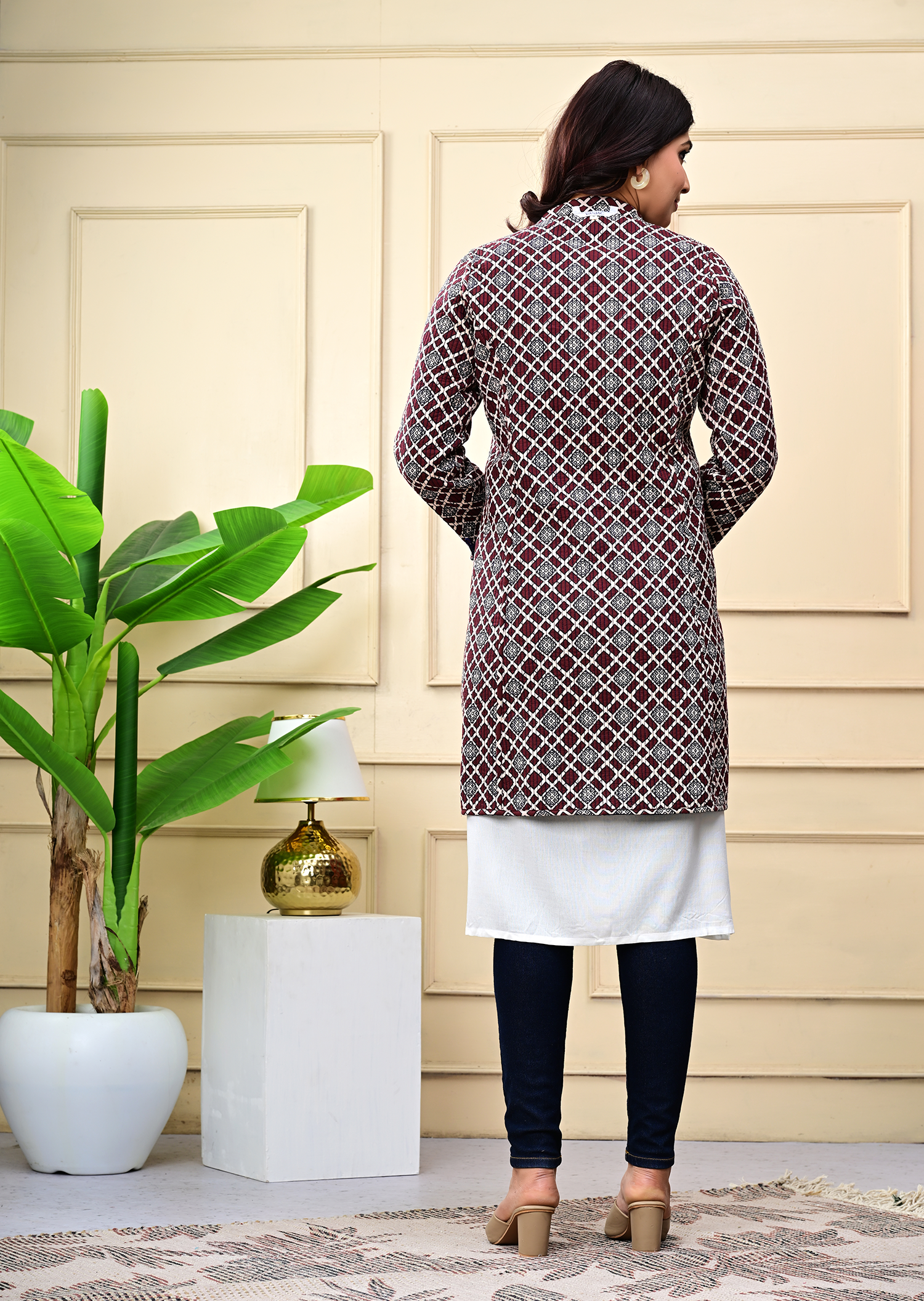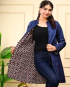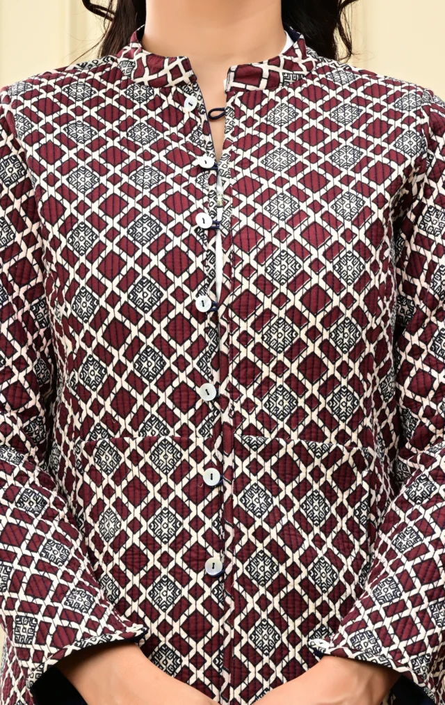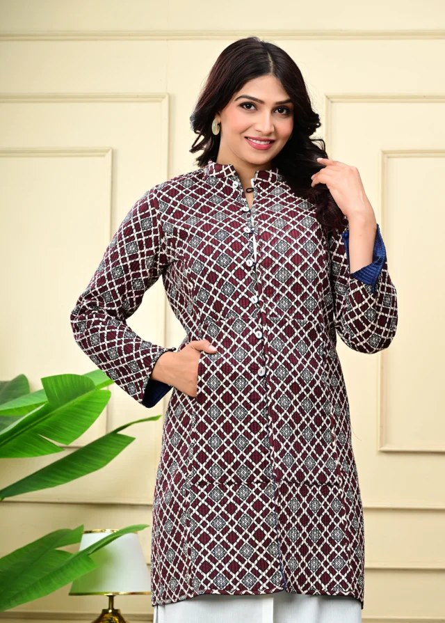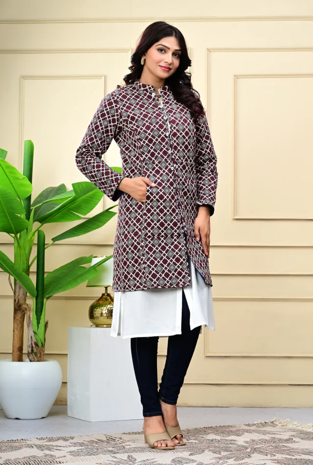 Lightweight quilting adds warmth without bulk, making it the perfect go-to for all seasons. The soothing blue palette and heritage-inspired print lend a touch of artisanal charm, while the classic silhouette makes it easy to pair with your everyday or occasion wear.