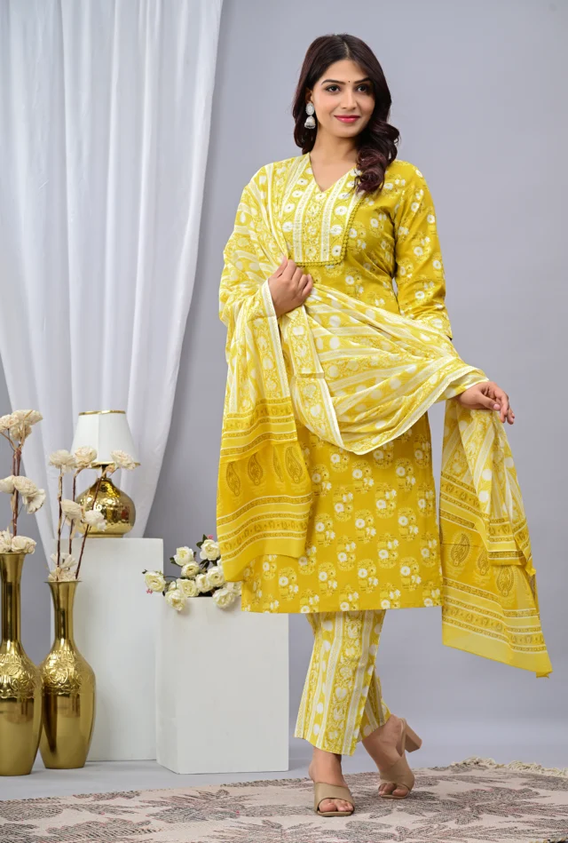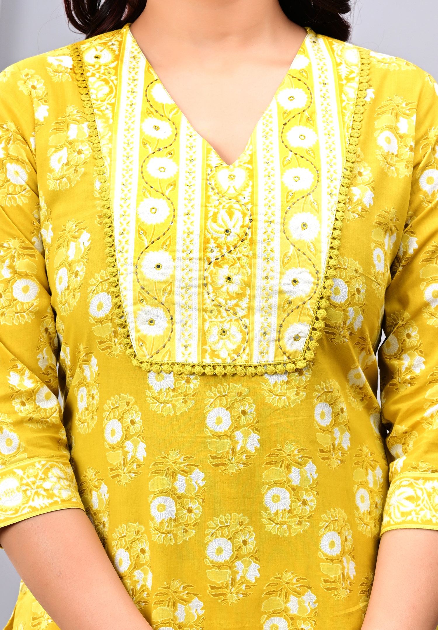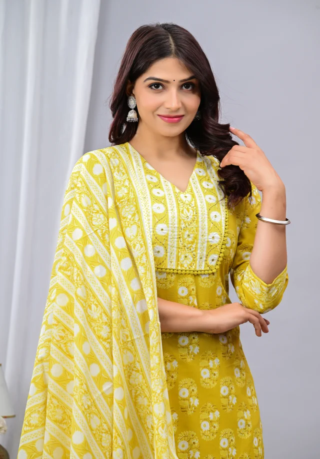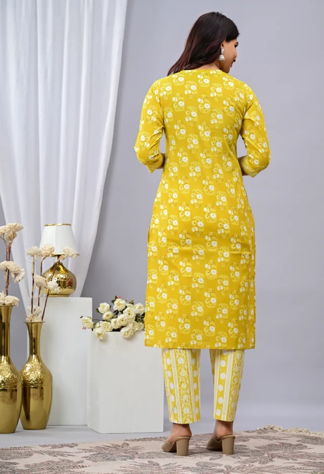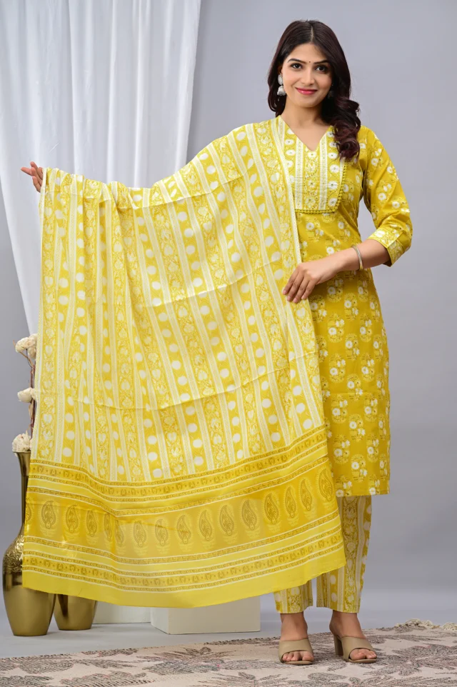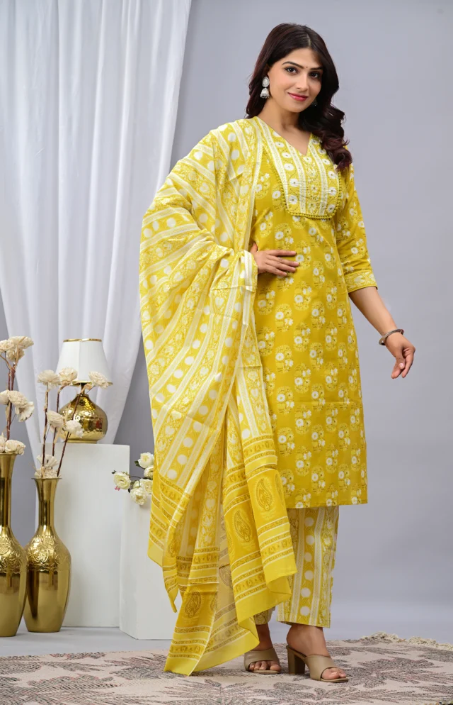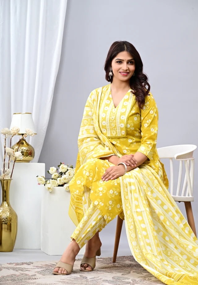 Brighten up your everyday wardrobe with our Yellow Cotton Floral Kurta Set — a breezy, elegant ensemble that celebrates sunny days and artisanal details. Crafted from soft, breathable cotton, the kurta features a beautiful floral print that brings a fresh, feminine vibe to your look.