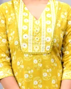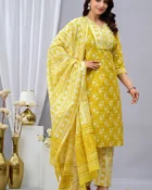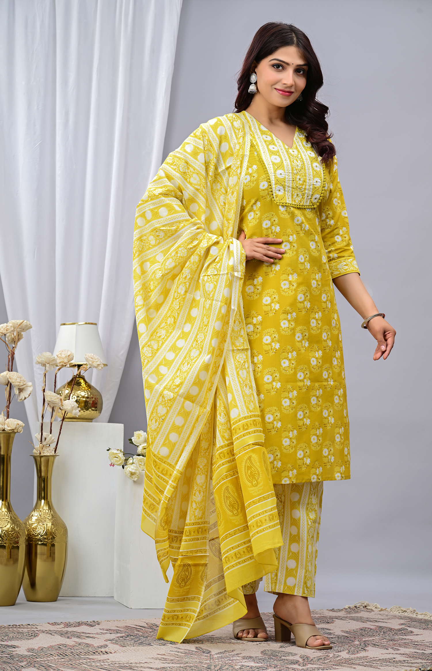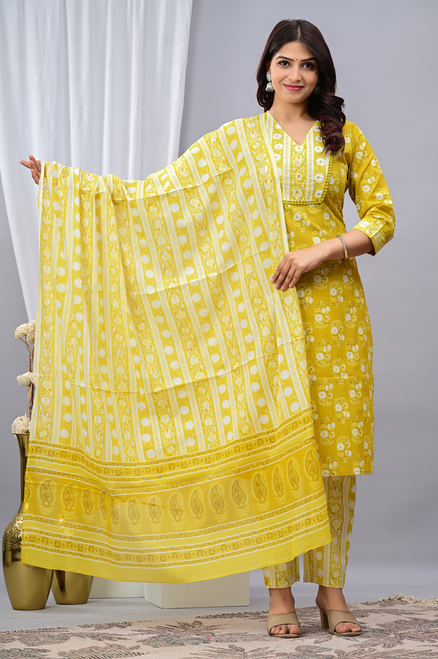 Bask in effortless charm with this Yellow Cotton Floral Kurta Set, accented with delicate hand work on the neckline and paired with a flowy printed dupatta.